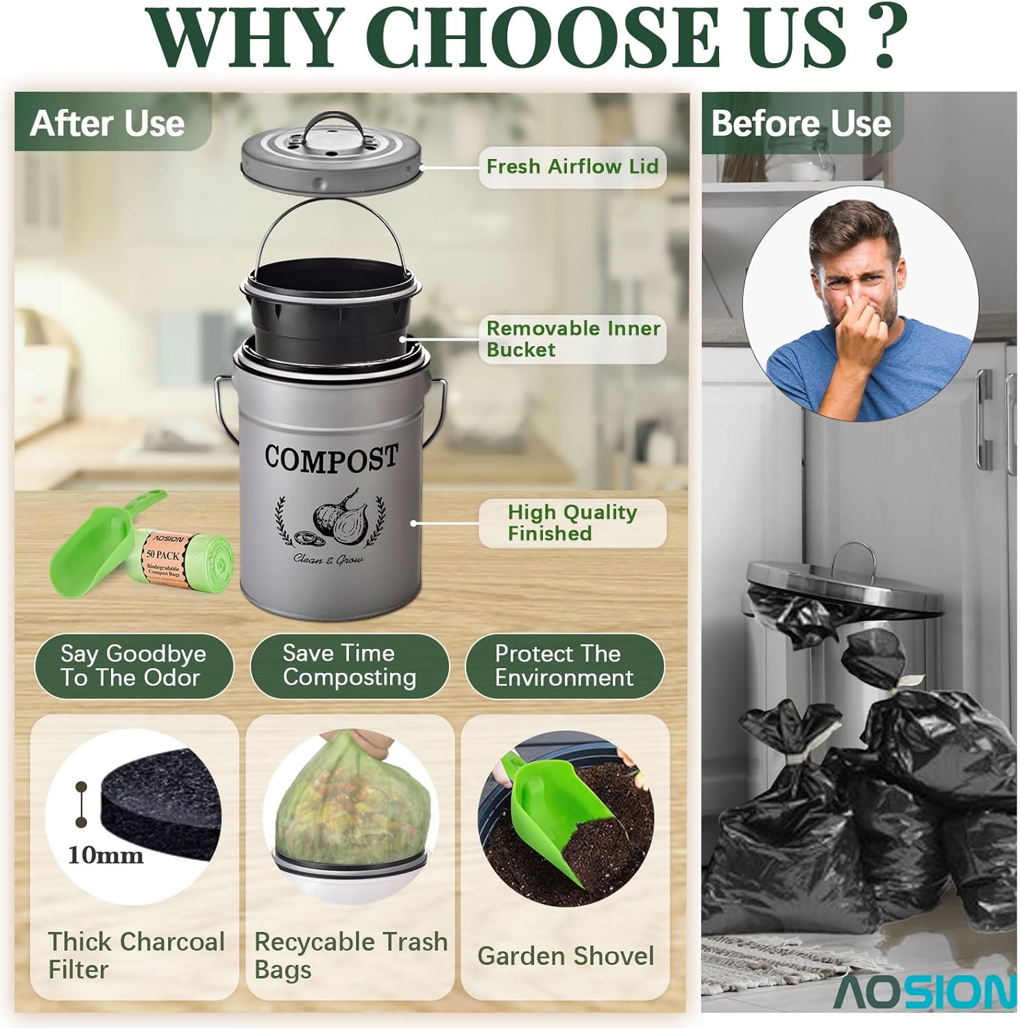 • 【FARMHOUSE STYLE】:The unique "COMPOST" logo on the front is designed with farmhouse style, which can complement any kitchen decoration.Not only does our indoor compost bin for kitchen make a stylish decoration but it’s also functional and great for a greener environment.