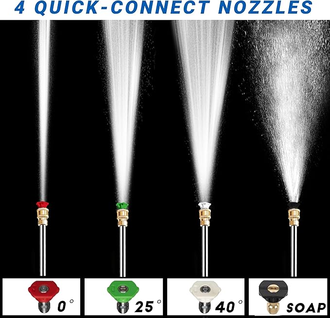 - [๐ ๐๐ฎ๐ข๐๐ค-๐๐จ๐ง๐ง๐๐๐ญ ๐๐จ๐ณ๐ณ๐ฅ๐๐ฌ - ๐๐ซ๐๐๐ข๐ฌ๐ข๐จ๐ง ๐๐ฅ๐๐๐ง๐ข๐ง๐ ๐๐จ๐ซ ๐๐ฏ๐๐ซ๐ฒ ๐๐๐ฌ๐ค ] Switch 4 quick-connect nozzles (0ยฐ, 25ยฐ, 40ยฐ, and soap) easily, each designed for specific tasks. From high-pressure jets (0ยฐ) for deep stains to a gentle 40ยฐ spray for delicate surfaces like vehiclesโthis washer covers every cleaning need with ease, for gutters, sidewalks, decks, patios, outdoor furniture, car/RV, mechanical maintenance, and home remodeling.