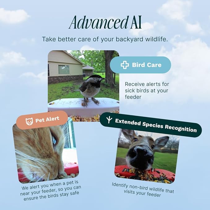 • AI-POWERED BIRDWATCHING APP: The Bird Buddy app uses AI to identify bird species and individual birds, detect signs of illness, and recognize other animal visitors. Get real-time alerts when birds visit your bird feeder and learn interesting facts about all your local birds. Enhance your experience with our Premium Subscription to easily organize photo collections and share your bird photos with friends & family.