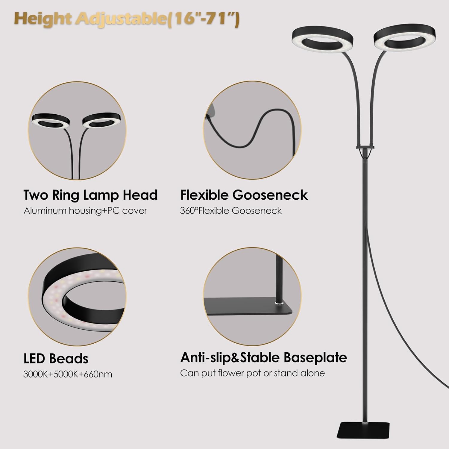 • 【Designed for Medium & Large Plant Growth】: This plant growth light features adjustable dual-head design that can rotate 360°, providing a larger and more uniform coverage area for plants. It comes with a high-quality non-slip base (no toppling over), ensuring stability. The grow light is equipped with three detachable aluminum alloy rods, adjustable to heights of 32/47/63 inches. It is ideal for home gardening, flower exhibitions, large potted plants, and huge indoor plants.