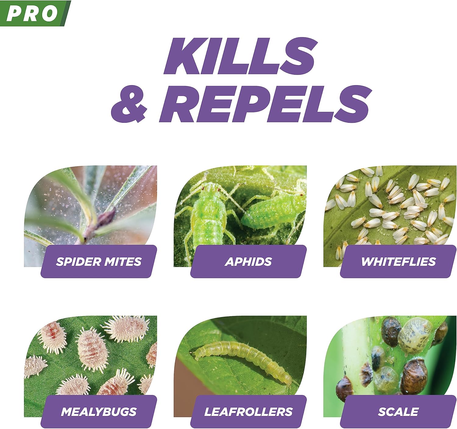 • KILLS AND REPELS INSECTS - Kills common soft-bodied insects including spider mites, two-spotted spider mites, aphids, whiteflies, mealybugs, leaf rollers, scale, thrips, pepper thrips and russet mites.