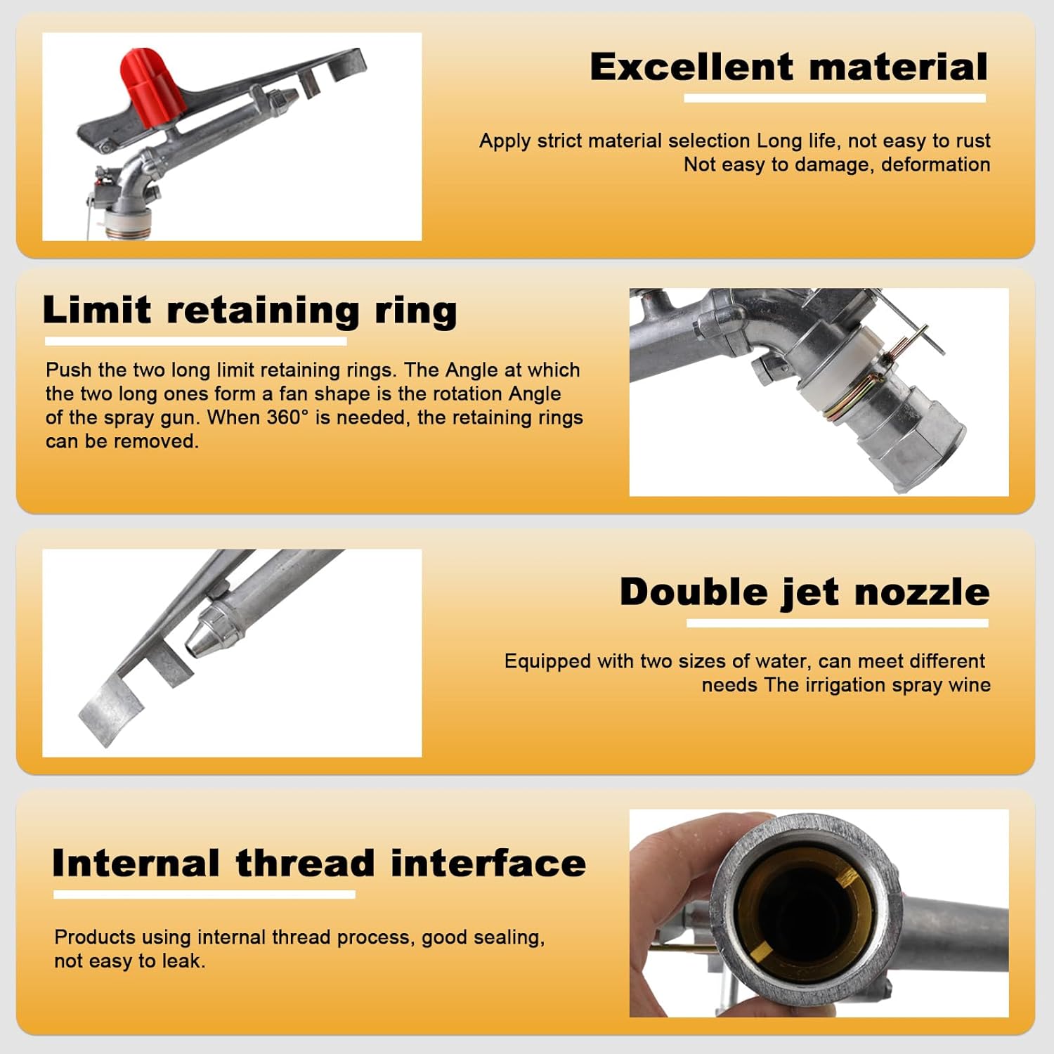 • 【WIDE APPLICATION】Irrigation sprinklers are mainly used for large-scale agricultural sprinkler irrigation in farms, orchards, tea gardens, forestry, seedlings, wheat, etc., lawns, greening, gardens and other large-scale gardening sprinkler irrigation, and can also be used for factories, mines, dust removal, cooling, and urban greening