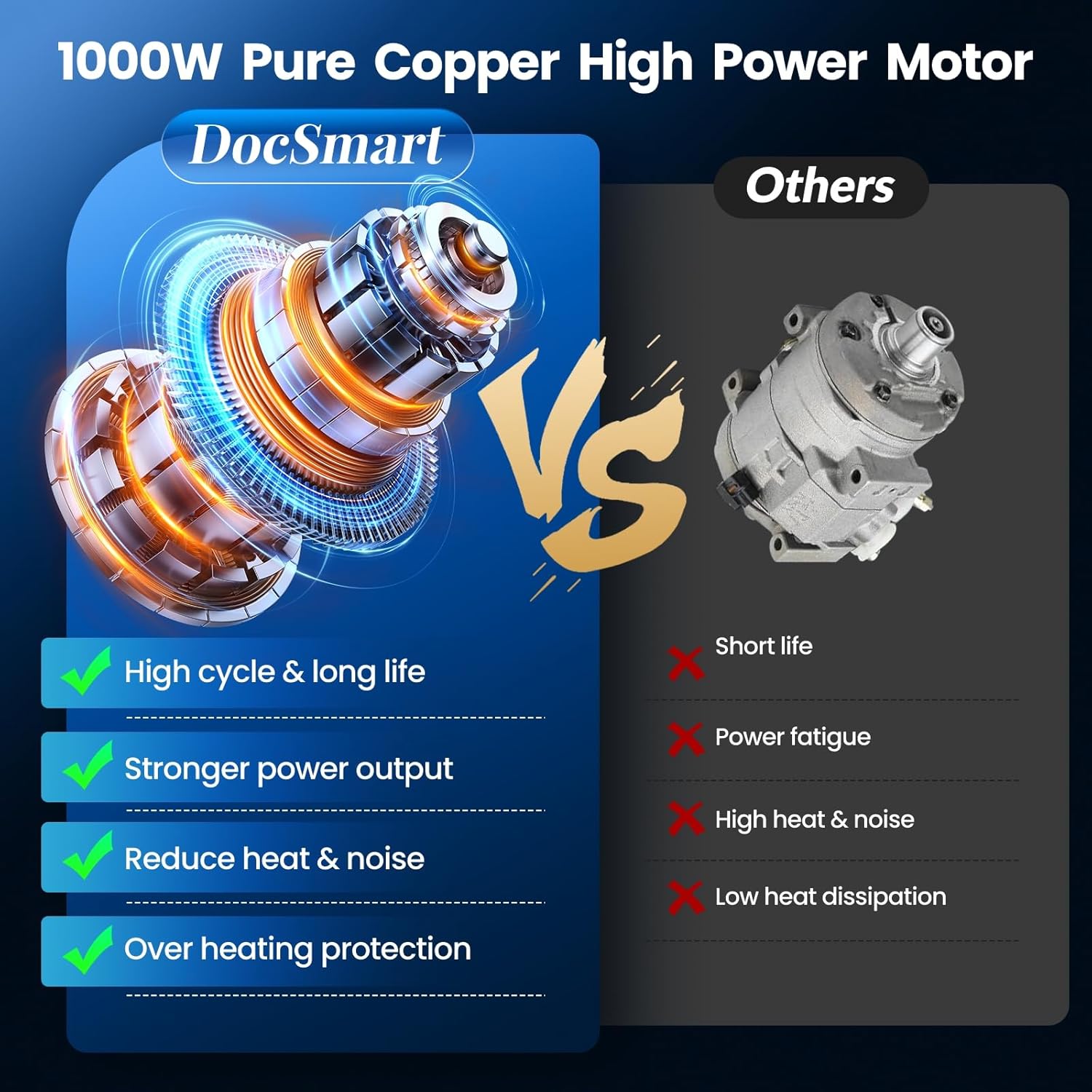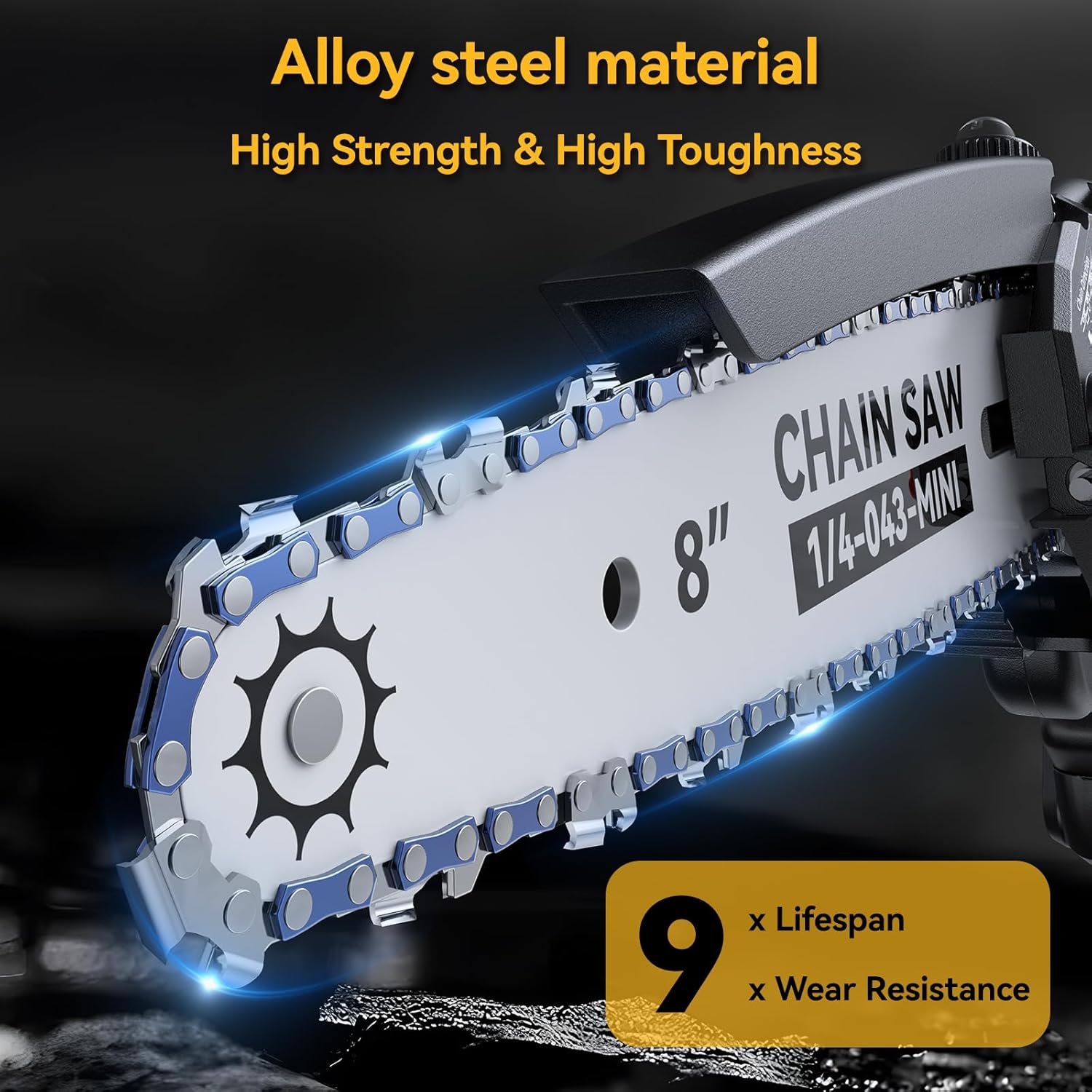 • High-Performance Motor: A 1000W pure copper motor drives the mini chainsaw at 26ft/s and delivers faster and more efficient cuts, cutting 6-inch branches in 8s with no effort(actual time may vary depending on the size and hardness of the wood). Thanks to the deep quenching process, it ensures smooth cutting.