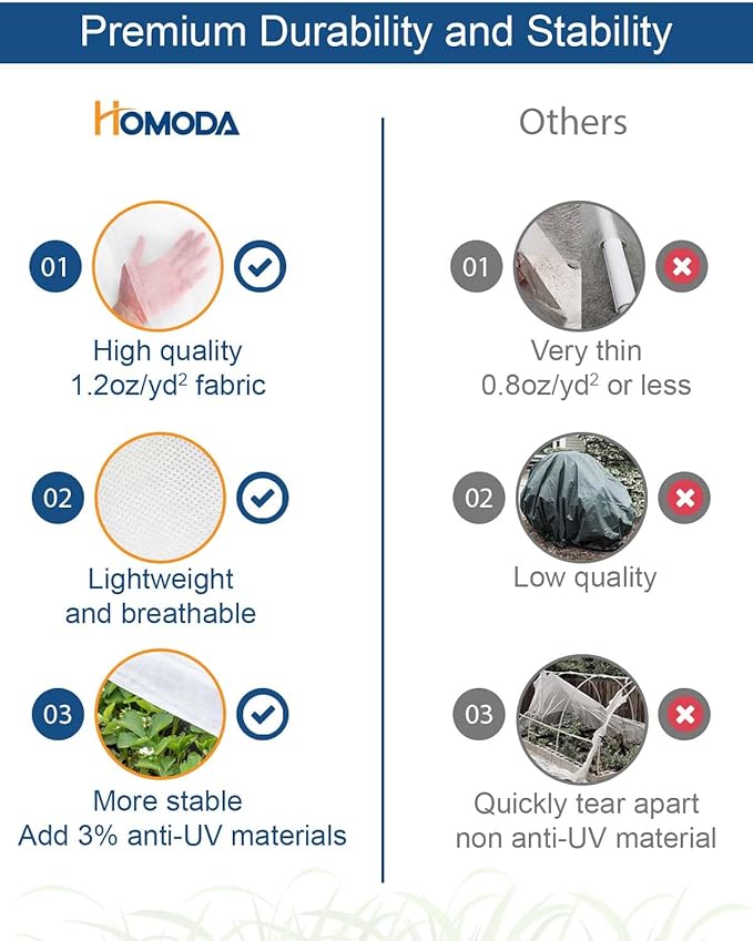 • User-Friendly, Satisfaction Guaranteed: Simply drape the frost plant covers over your plants and secure them with soil, stones, or staples. For added flexibility, support the covers with a hoop, creating ample room for your plants to breathe and flourish. With Homoda, satisfaction is guaranteed in every effortless application.