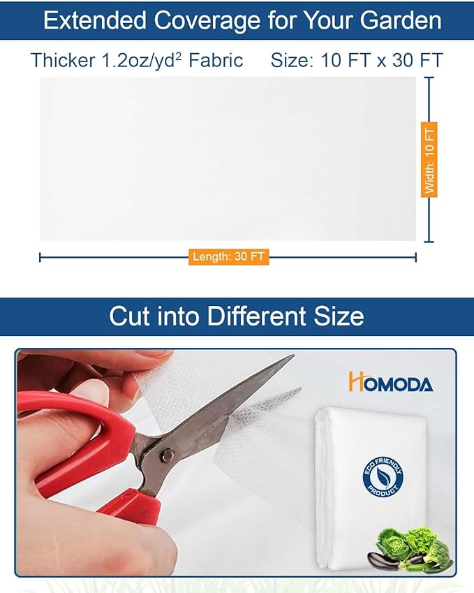 • Extended Coverage for Your Garden: With a substantial size of 10 ft wide and 30 ft long, Homoda plant protectors for winter offer ample coverage for various plants. Easily customize by cutting them into different sizes to cover potted plants, flowers, vegetables, raised beds, trees, or shrubs.