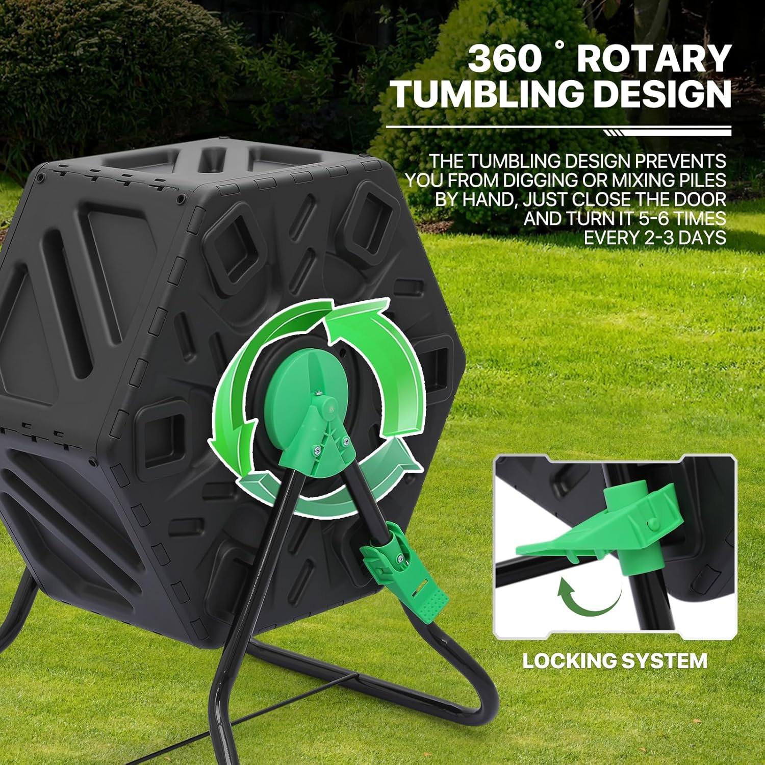 • Tumbling Design - The tumbling design speeds up the composting process by ensuring fully aerated compost materials. The black compost tumbler absorbs all the heat from the sun and allows the composting process to take place in warm temperatures. Simply fill and tumble 5-6 times every few days, no digging or hand mixing required.