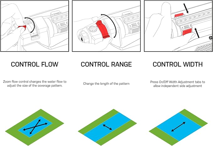 • WIDTH ADJUSTMENT TABS – Customize the spray pattern from wide coverage to narrow zones with simple tab settings