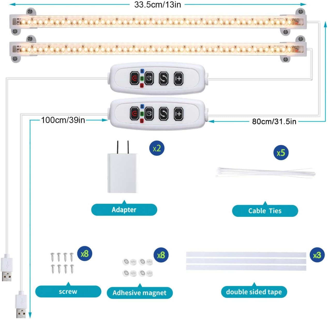 • 【Material Safety & Easy Installation】All aluminum material, strong corrosion resistance, hard to melt. The grow light pack comes with screws, ties, double-sided tapes and magnets to provide four mounting options. Compact design fits for various fixtures and surfaces. The power cord is 71 inches long for easy using in office,indoor,plant shelf,greenhouse etc.