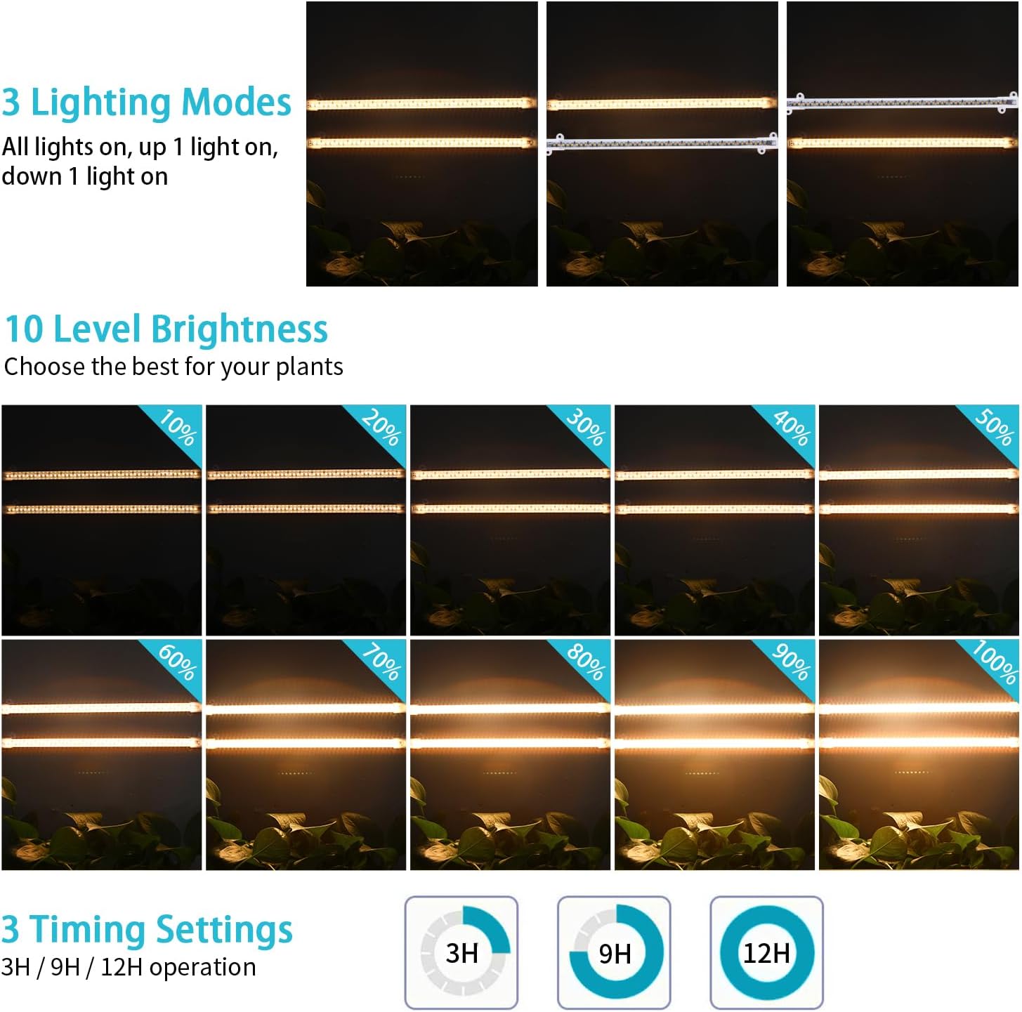 • 【3 Switch Modes & 10 Dimmable Level】LED grow lights has 10 levels of brightness that can meet the needs of your plant when it is at different growth stages. 3 Switch Modes: A Light On, B Light On and Both Light On. Full-spectrum white light simulates sunlight and promotes plant growth, flowering and fruiting.
