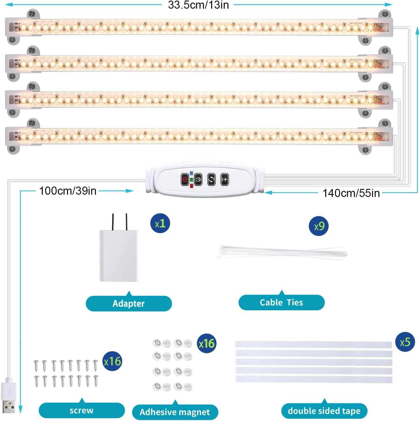 • 【Material Safety & Easy Installation】All aluminum material, strong corrosion resistance, hard to melt. The grow light pack comes with screws, ties, double-sided tapes and magnets to provide four mounting options. Compact design fits for various fixtures and surfaces. The power cord is 96 inches long for easy using in office,indoor,plant shelf,greenhouse etc.