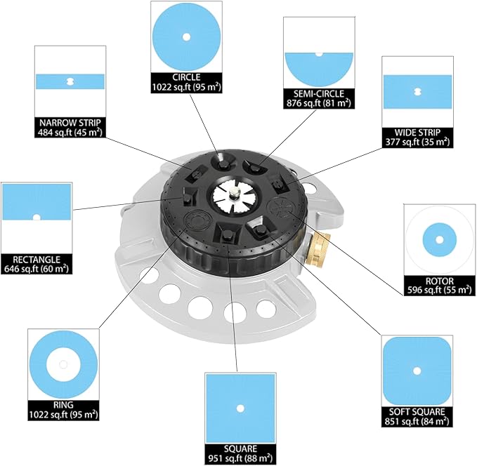 • NINE SPRAY PATTERNS OFFER NINE UNIQUE COVERAGE AREA - STYDDI lawn sprinkler offers 9 practical spray patterns for watering any shape yard and garden. With just a twist, you can flexibly select a pattern that meets different plant needs. The 9 patterns to choose from are spinner, outer ring, small circle, half circle, rectangle, narrow rectangle, square, half square, and rounded square.