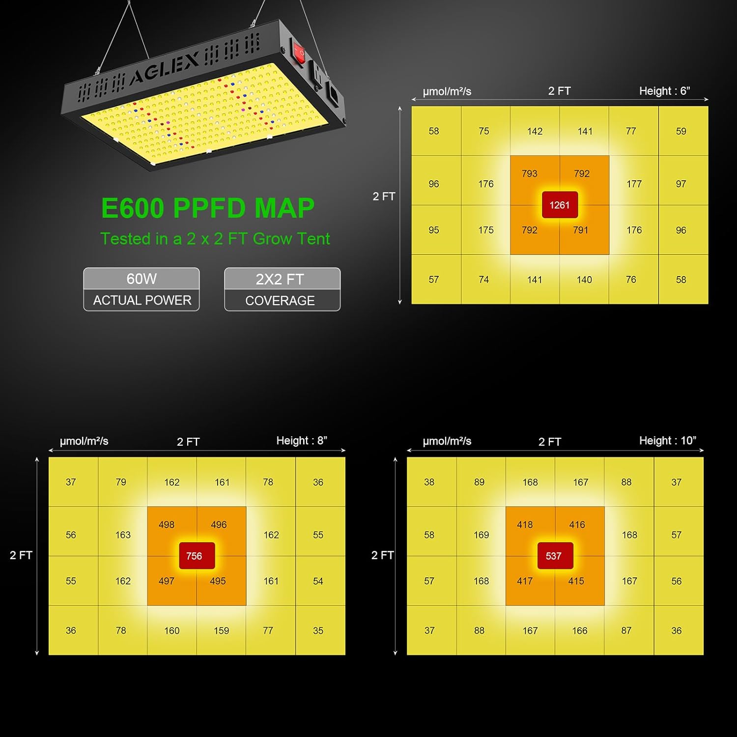 AGLEX E600 LED Grow Light, Full Spectrum Grow Light with UV IR Diode, Grow Lights for Indoor Plants with Daisy Chain & Built-in Silent Fan, Plant Growing Lamps for 2x2 FT Coverage