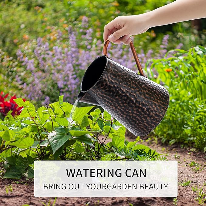 • The unique hammered pattern design on the surface adds a touch of personality and character to the watering can. It not only serves as a practical tool for watering plants, but also doubles as a decorative item for your garden or indoor plants.