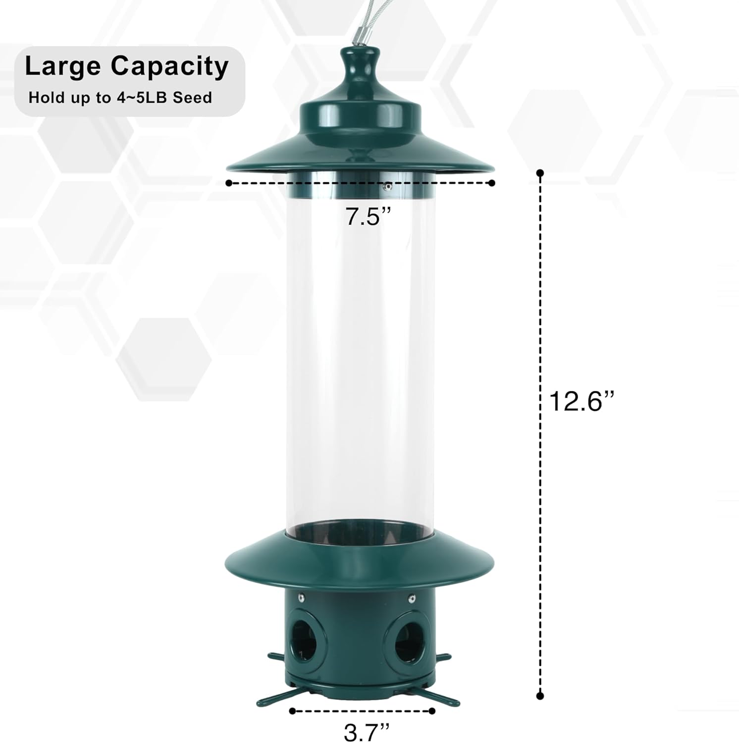 • Large Seed Capacity - Say goodbye to frequent refills. This birdfeeder can hold up to 4-5 pounds of seeds, whether it's black-oil sunflower seeds, sunflower chips, or safflower seed. More seeds mean more bird-watching without the hassle.