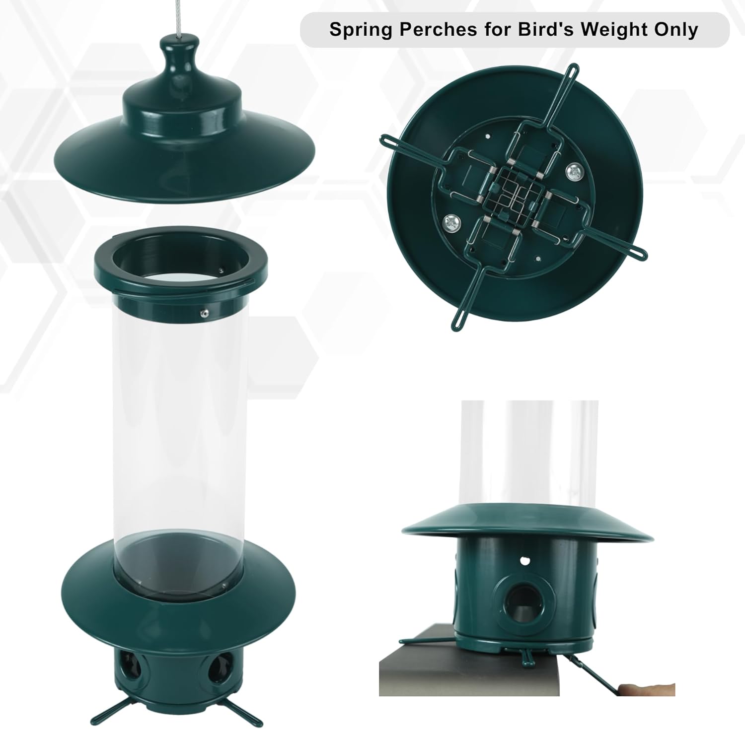 • Spring Perches Design - Our bird feeder spring perches are designed to hold birds weight, but not those pesky squirrels. To make it even harder for squirrel to jump onto it, we suggest position the feeder at least 10-12 feet away from any potential launching points.