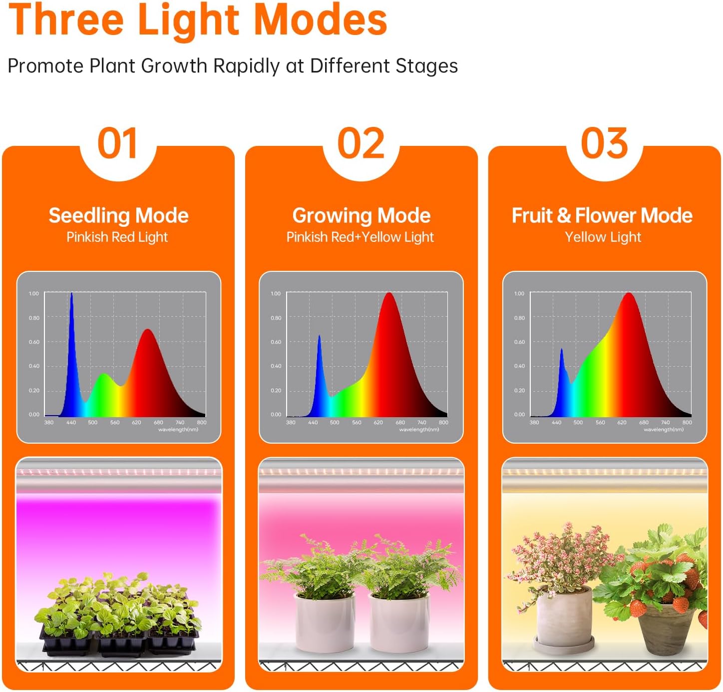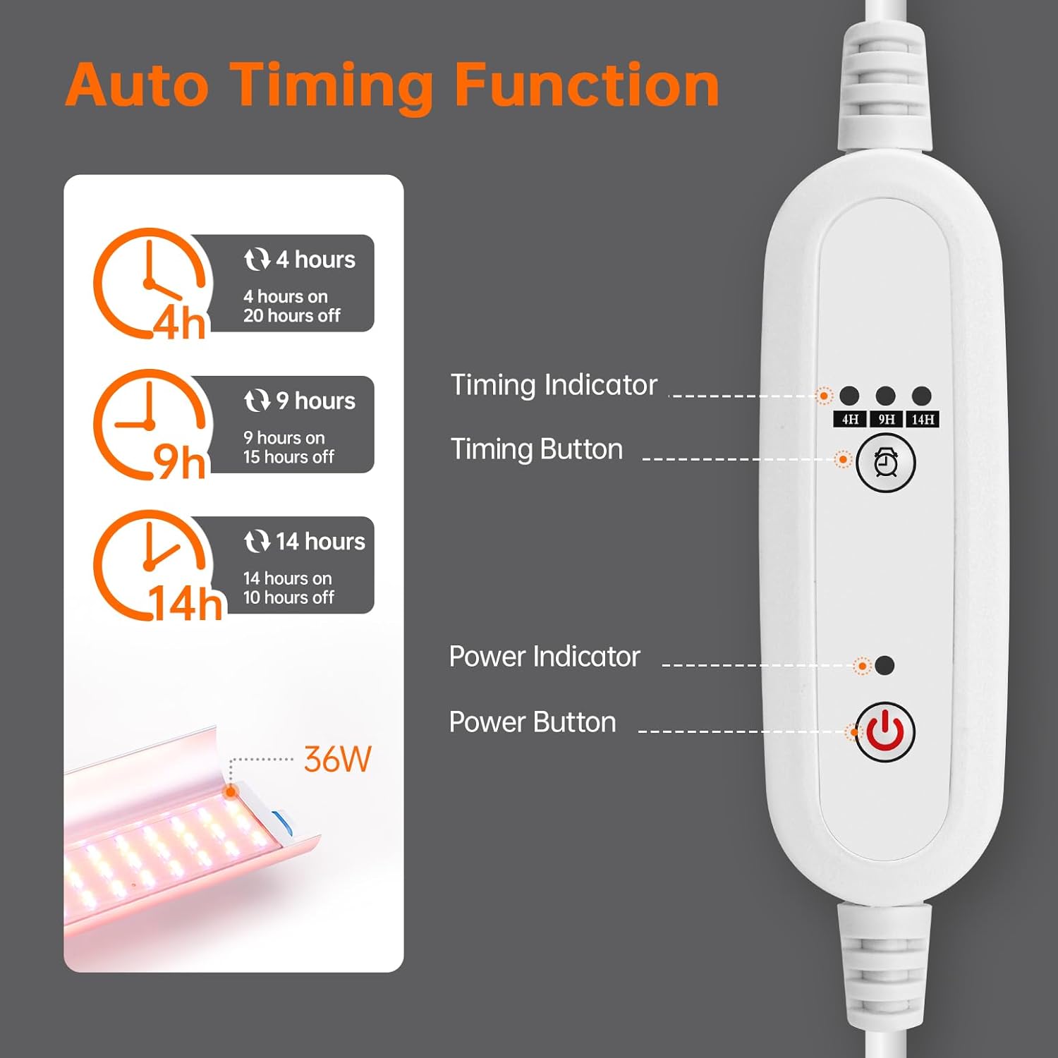 • 【Adjustable Color Light with Timer】Provides optimal light conditions for every growth stage with its three lighting modes(Pink Purple/Yellow/Mix Light) - Seedling, Growing, and Blooming. 4/9/14 timer mode, travel or work without worrying about plant growth, and fully automatic timer mode to take care of plant growth all year round