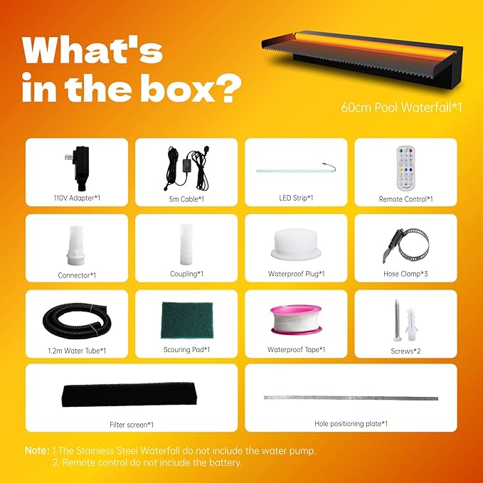 • ⏩Decoration Pool Waterfall⏪ Pamopamo waterfall spillway makes your garden swimming pool and koi pond elegant, fashionable and beautiful. The color change of LED lights and the gentle sound of water running make your patio more special at night.