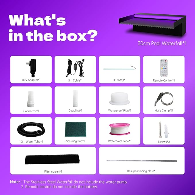 • ⏩Decoration Pool Waterfall⏪ Pamopamo waterfall spillway makes your garden swimming pool and koi pond elegant, fashionable and beautiful. The color change of LED lights and the gentle sound of water running make your patio more special at night.