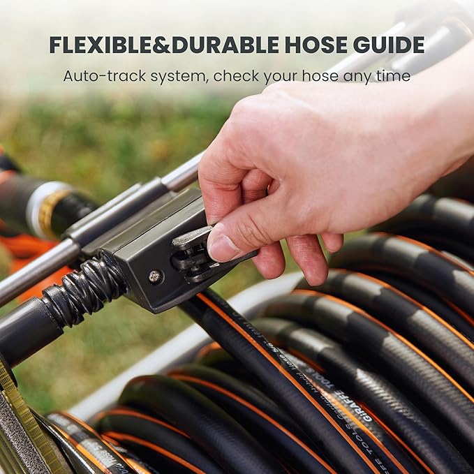 • Hose Guide System: Reinforced axis and convenient hose guide system allows you to roll up the garden hoses neatly without effort. All you need to do is wind the non-slip handle. Get free from annoying and dirty hand-held way of winding up hoses.