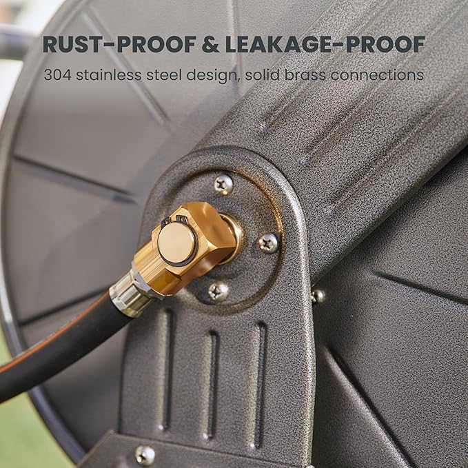 • All-weather Construction: Heavy duty metal frame is coated with special powder finish, making the garden hose reel cart suitable for all weather. The solid brass connector makes the garden hose leakage-proof and wear-resistant.