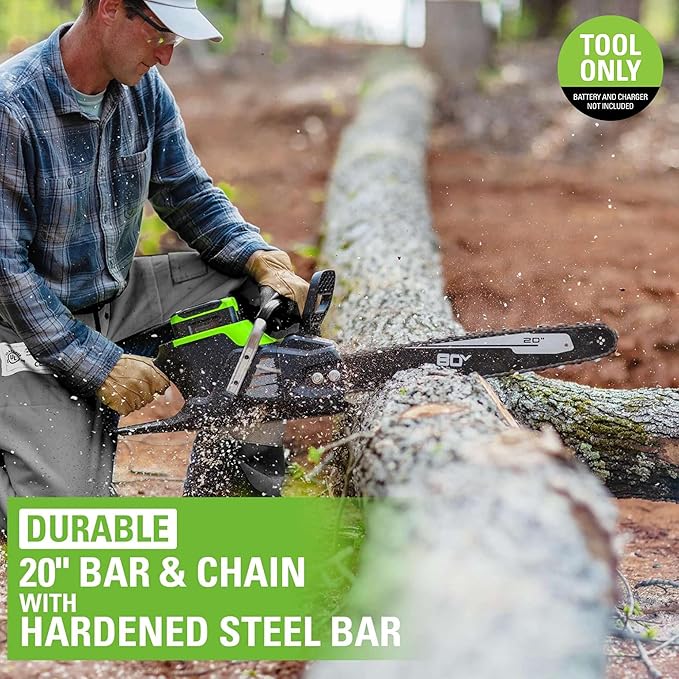 Greenworks 80V 20" Brushless Cordless Chainsaw (Great For Tree Felling, Limbing, Pruning, and Firewood), 75+ Compatible Tools, Tool Only, Green