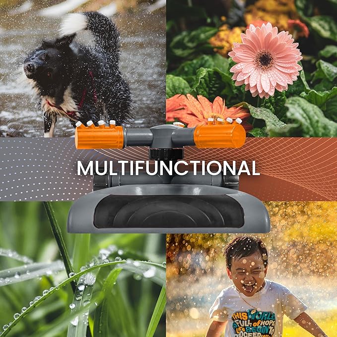 • Easy To Use: Simply attach your garden hose to the lawn sprinkler hose connector and turn on the faucet. As the water pressure increases the rotating arms will begin to spin and provide a rain like irrigation to your lawn!