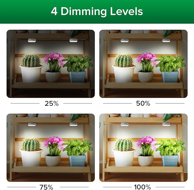 • 4/8/12 HRS AUTO ON/OFF TIMER & 4 DIMMING LEVELS: The LED 2-head grow light operates from a built-in timer with 3 modes cycle timing function which stays on for 4/8/12 hours and off for 20/16/12 hours. The indoor plant lights for indoor plants full spectrum offer 4 level brightness settings to different plants requirements ranging from 25%, 50%, 75% to 100%