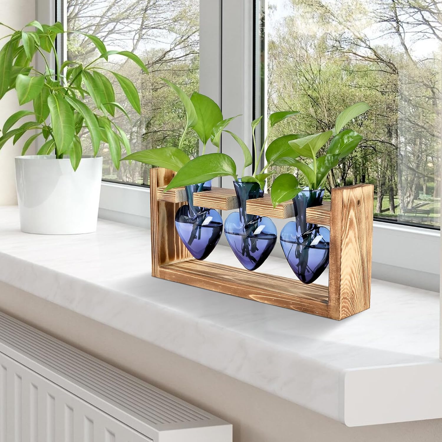 Plant Terrarium Propagation Stations Hydroponics Home Garden Decoration Gift for Women with Wooden Stand Heart Shaped Colored Glass Vase