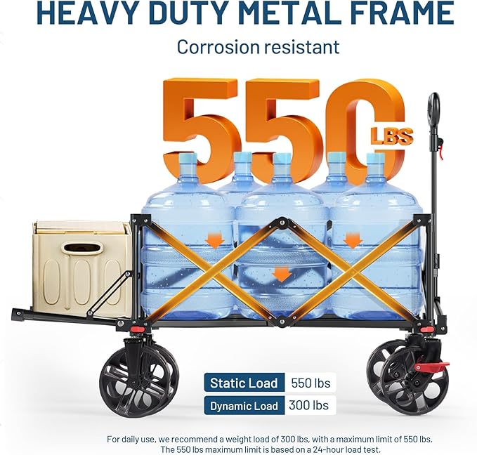 • STURDY FRAME: Crafted with a heavy-duty alloy steel frame with a dynamic load capacity of 300 lbs and a static load limit of 550 lbs, this folding wagon features long-lasting 500D Oxford fabric and is built to last; the mesh bottom allows for easy cleaning with water.