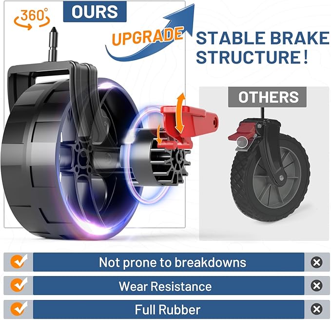 • All-TERRAIN WHEELS W/ BRAKES: 7.5"x3.4" big wheels with 360° rotating front wheels and built-in brakes. Ideal for camping, shopping, or gardening without causing fatigue.