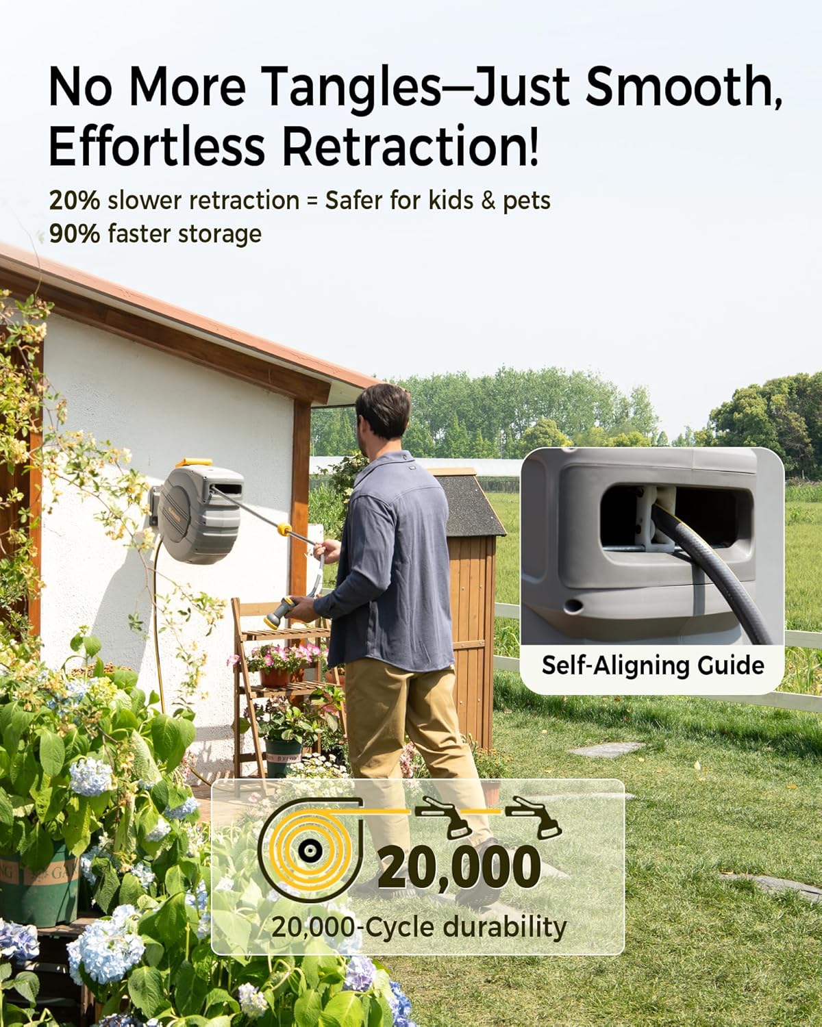 • 20,000-Cycle Self-Winding System: Industrial-grade alloy spring ensures consistent retraction force. The self-winding hose reel retracts 20% slower to prevent whipping hazards while achieving 90% faster storage with smooth, tangle-free operation