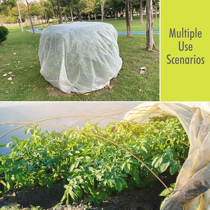 • Full Protection Plant Cover: 10x33 FT plant covers freeze protection for outdoor plants not only could offer a strong protection from winter freeze, frost, snowstorm, heavy rain, strong sun lights and other harsh weather, but also could prevent your plants from attacking by birds, pests and insects. Frost cloth plant freeze protection is ideal for extending the growing season into early spring and late and delay the harvest season