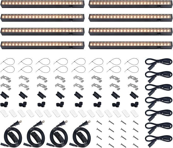• What You Get: 8 x Barrina t5 Grow Light, 4 x Power Cord with ON/OFF Switch, 7 x Connecting Cord(20''), 16 x Installation clip, 16 x Cable tie, 16 x Magnetic bar with double-sided tape, 8 x Small connector, 8 x Dust cap