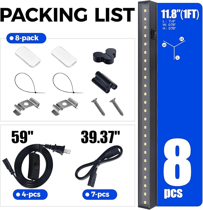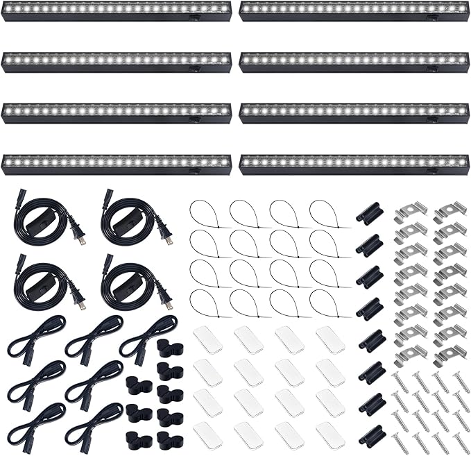 • What You Get: 8 x Barrina t5 Grow Light, 4 x Power Cord with ON/OFF Switch, 7 x Connecting Cord(20''), 16 x Installation clip, 16 x Cable tie, 16 x Magnetic bar with double-sided tape, 8 x Small connector, 8 x Dust cap