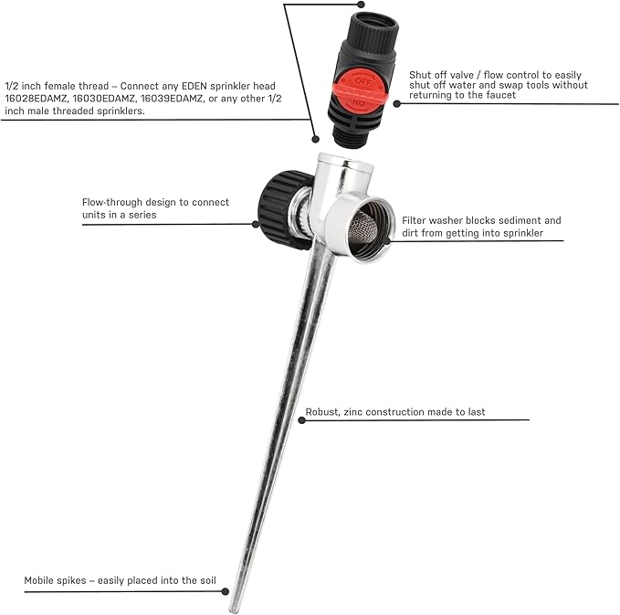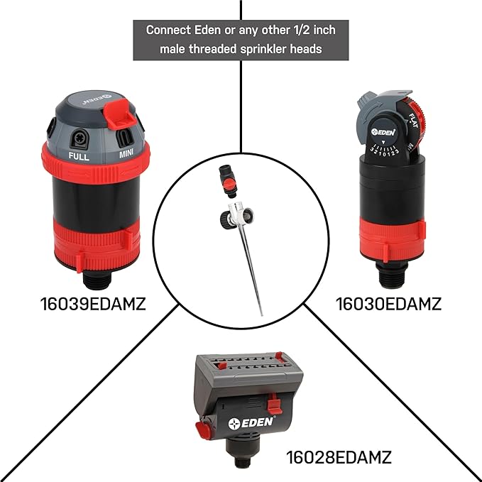 • Attaches directly to your standard ¾” garden hose and is compatible with any Eden sprinkler head or other ½ inch water inlet sprinkler heads