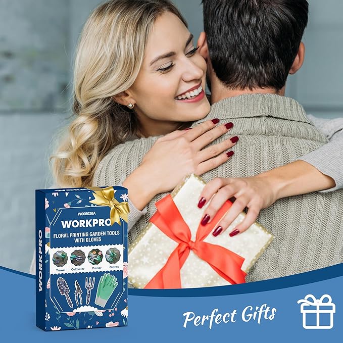 WORKPRO Aluminum Garden Tool Set, 4PCS Heavy Duty Hand Garden Tools with Box Include Trowel, Rake, Pruner, Garden Gloves, Floral and Insect Printing, Garden Gifts