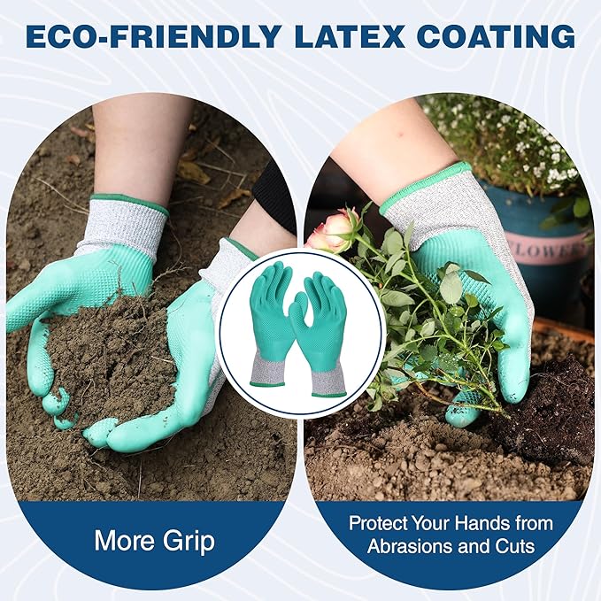 • HIGH QUALITY DURABLE MATERIAL: The gardening tools are made of high-quality aluminum alloy, much more durable than other iron-made tools. They are rust-proof, sturdy and easy to clean. Practical hanging holes is easy to storage. Meanwhile the garden gloves provide protection for you. Perfect for planting bulbs, flowers, vegetables
