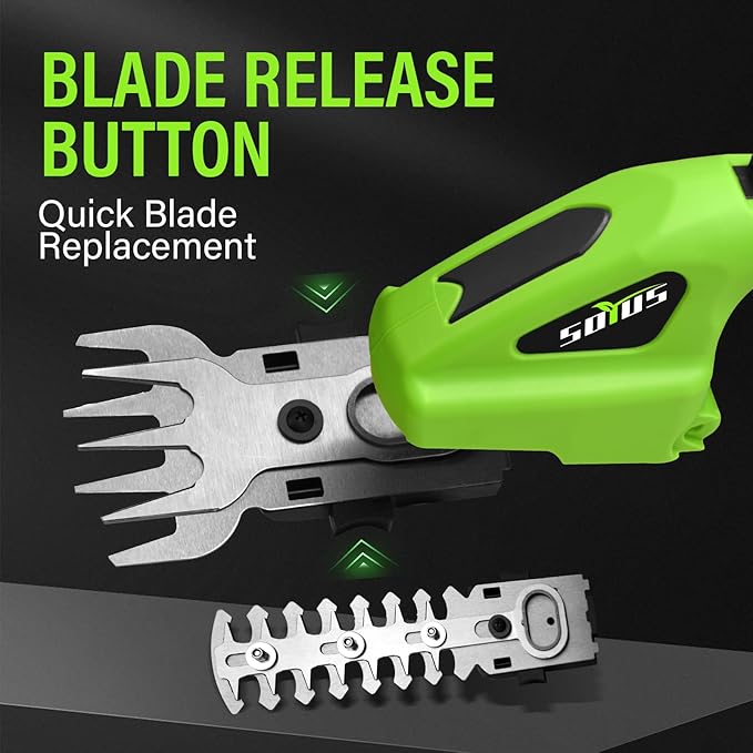 • TWO IN ONE DESIGN - SOYUS cordless hedge trimmer are designed to quickly and easily switch from grass shear to hedge trimmer with the blade release button. The short blades are designed to cut lawns and the long blades are designed to cut hedges and bushes. This handheld lawnmower will meet your daily mowing needs.