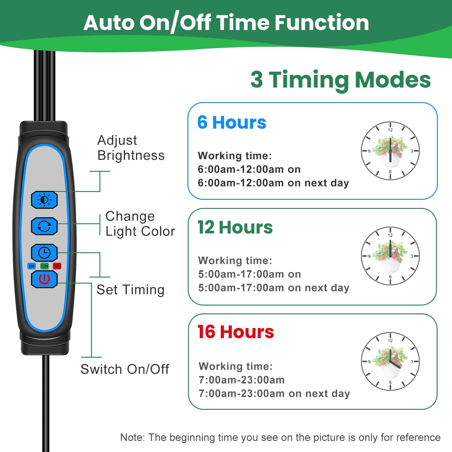 • [6 12 16H Timer] Most of the plant lights with built-in controllers on the market do not exceed the timed 12H, and ours has been upgraded to exceed 12H, which is more friendly to light-loving plants, so that the plants grow better. Set the timing time(6H 12H 16H), you don’t need to manually turn on and off the grow light. The grow light will convenient to takes good care of your plants when you go out to work or on vacation
