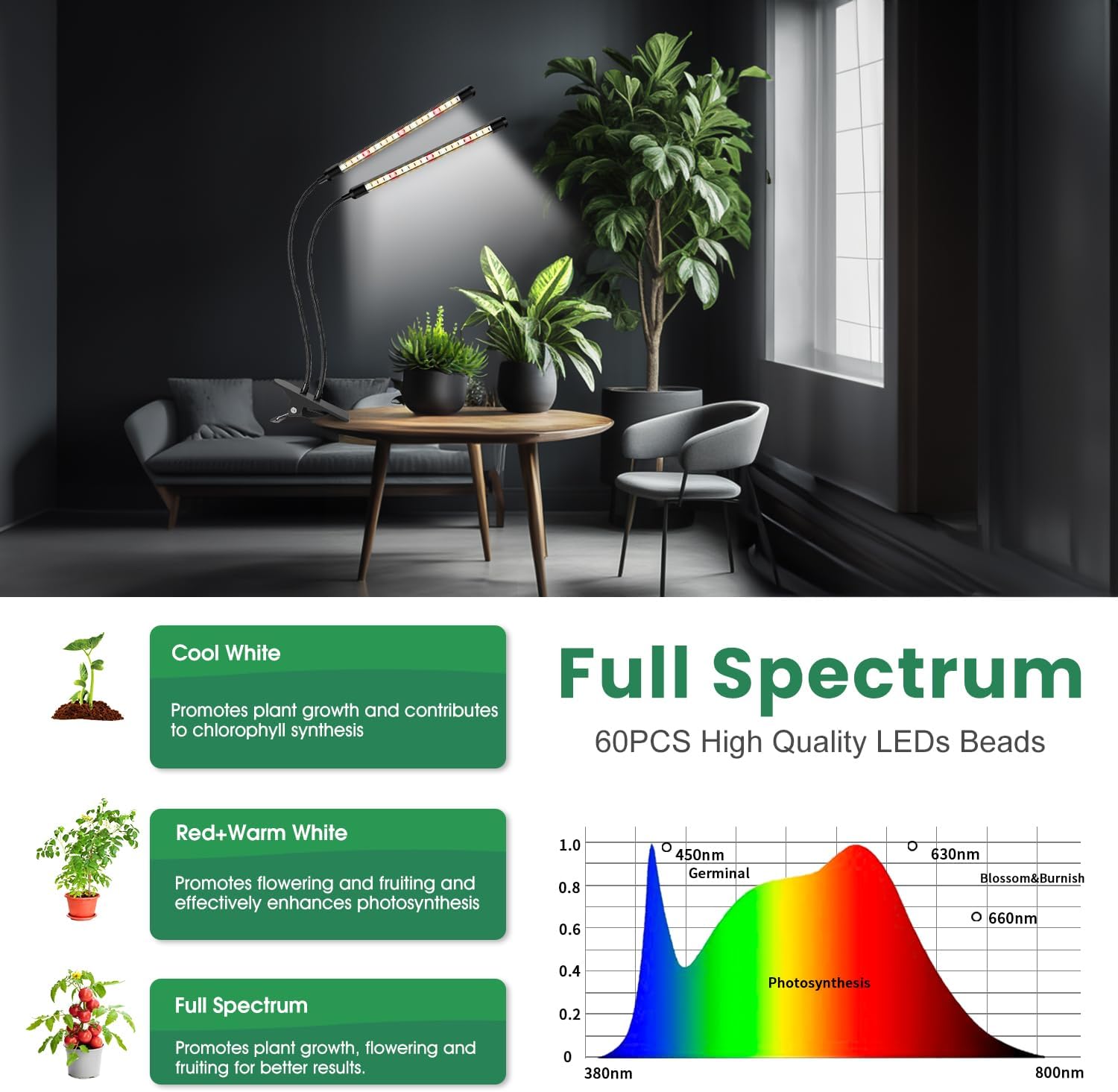 • [Full Spectrum & Cost-effective] This 2 heads grow light is equipped with 6 Red +14 White+20 Warm White LEDs for each light tube(40 LEDs in total), the spectrum is close to natural sunlight, which is suitable for indoor plants in all growth stages, the light color is friendly to the eyes, low power consumption, energy saving, great for small plants