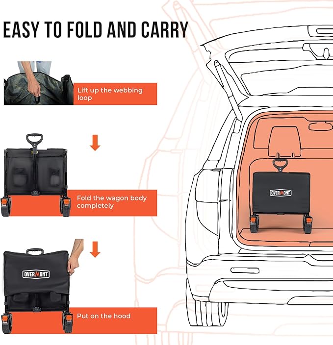 • 【𝐔𝐩𝐠𝐫𝐚𝐝𝐞𝐝 𝐋𝐚𝐫𝐠𝐞𝐫 𝐂𝐚𝐩𝐚𝐜𝐢𝐭𝐲-𝐒𝐦𝐚𝐥𝐥𝐞𝐫 𝐅𝐨𝐥𝐝𝐢𝐧𝐠】: Overmont collapsible wagon with wheels is upgraded with deeper and larger 200L storage space, measuring 49.2" x 22" x 22". It’s 𝟐 𝐓𝐈𝐌𝐄𝐒 larger than most other wagons and the ratio of folding size to expand size is 𝟏:𝟒, allowing for effortless storage in your car trunk and convenient transportation.