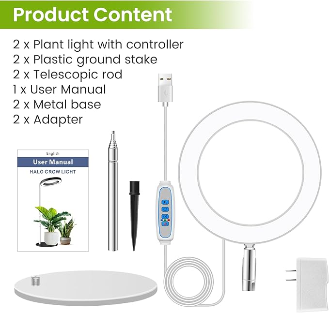 • Multipurpose Halo Plant Light: Our indoor plant light comes with a metal base and plastic ground stakes, 2 installation methods to suit different scenarios, making it easy to use on various surfaces such as desktops, countertops, or floors