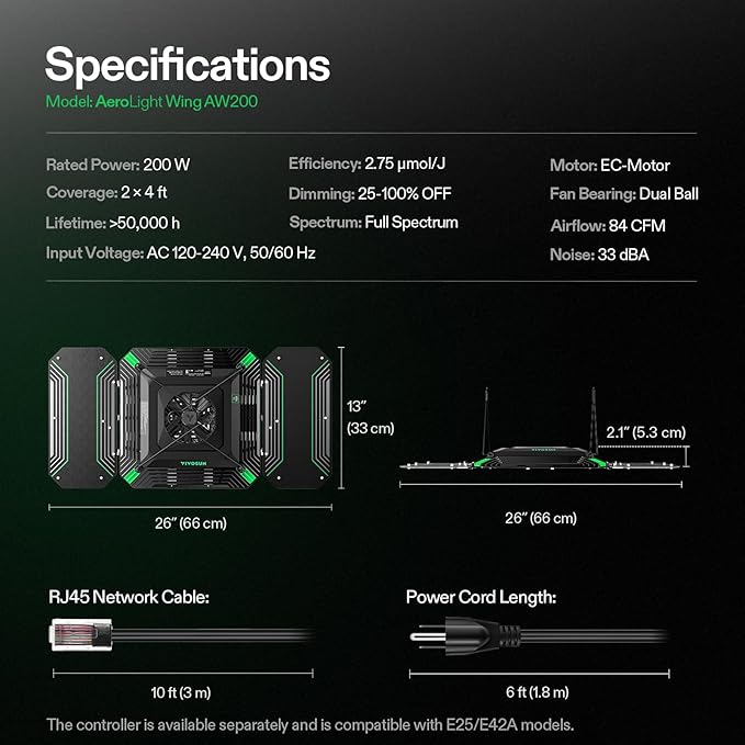 VIVOSUN AeroLight Wing AW200, Tunable Spectrum, LED Grow Light 200W with Integrated Circulation Fan, Compatible with App, Used with Controller E42A/E25 to Achieve More Functions