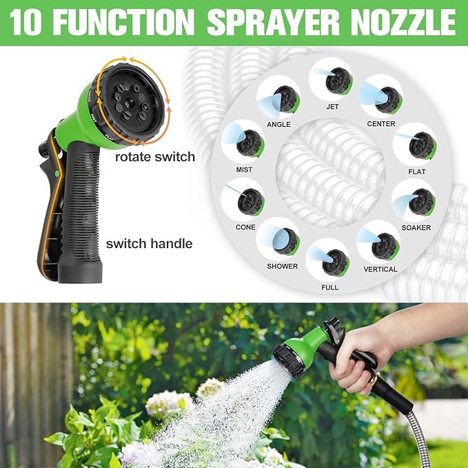 • 【Come with 2 nozzles】:Our hoses are equipped with two types of nozzle, 10-function water nozzle and 6-function nozzles, with a wide range of watering modes to meet the needs of different occasions, such as watering, car/boat washing, pet bathing, or pool cleaning.