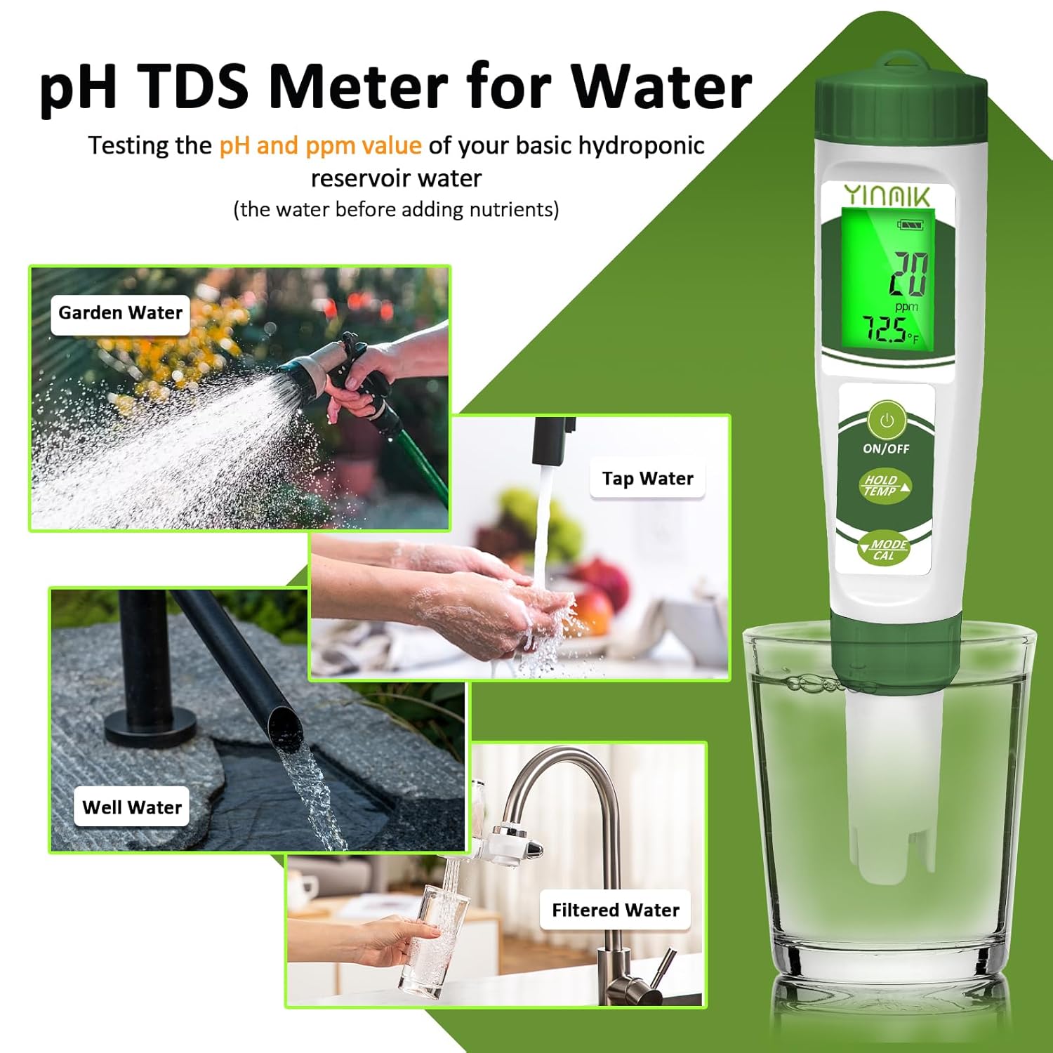 • YINMIK 4 in 1 pH Meter: Not only can be used in hydroponic system, but also can measure pH (0.01-14.00), EC (Conductivity), TDS (0-9990ppm), Temperature (32.0-122.0℉, 0.0-50.0℃) of aquarium & fish tank water, well water, filtered water, drinking water, kombucha brewing, wine and beer making, pool & spa & hot tub water. Use this pH Meter anywhere you want to test liquids