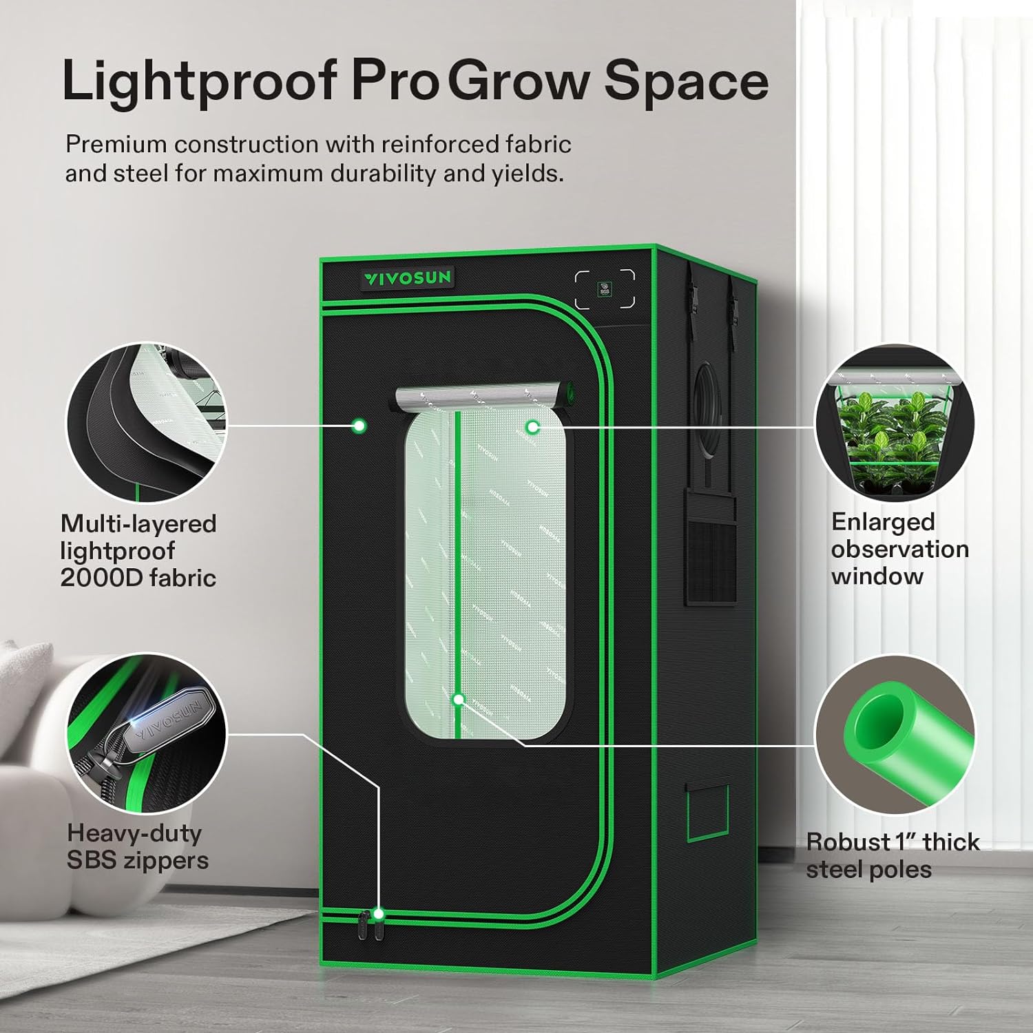 • PRO Grow Tent: The thickened fabric with enlarged window prevents light leakage for optimized yields while allowing easy viewing; Robust 1" steel poles with extra hanging bars reinforce structural integrity, supporting up to 150lbs; Transform the tent into a self-contained smart garden environment with the complete accessories set for seamless plant care from seed to harvest