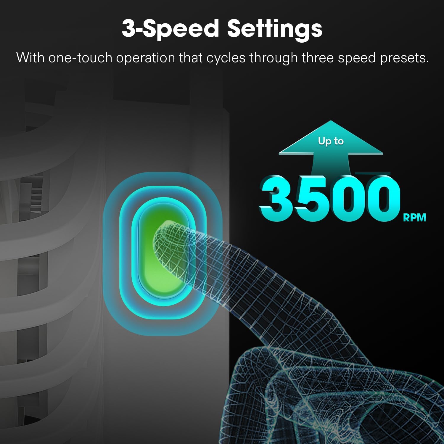 • 3-Speed Settings: With one-touch operation that cycles through three speed presets up to 3500 RPM, this compact fan offers tailored cooling customization; And with the integrated memory feature, your chosen fan speed is automatically retained if power gets disrupted