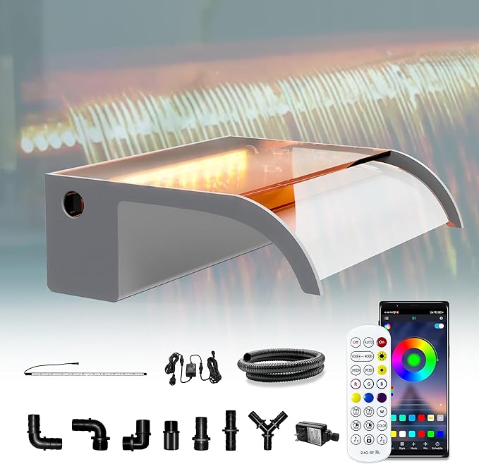 - 【Wider Water Flow Platform & Curved Open Lip Design】The pool waterfall has an 8-inch wide integrated welding water platform, 3.94-inch high water storage tank platform, and 90-degree tilt angle. This design creates a stable, smooth, vertical waterfall for a stunning water display. The soothing sound and sight of the cascading water create a relaxing environment for you enjoy