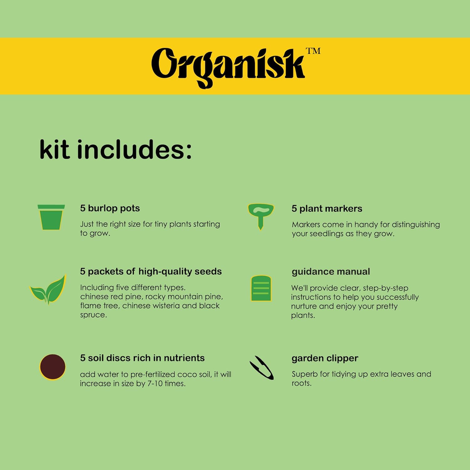 • Our kit includes 5 types of organic seeds (Rocky Mountain Pine, Flame Tree, Chinese Wisteria, Black Spruce, and Chinese Red Pine ) stored in seed-safe vials for successful germination. You'll also receive 5 biodegradable growing pots, 5 expanding-soil discs, 5 bamboo plant markers, 1 bonsai clipper, and a comprehensive instruction booklet.