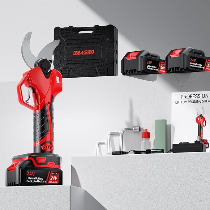 • ✅✅【Efficient Cutting&Intelligent Display】- DRAGRO professional electric cordless pruning shears is forged from SK5 high carbon steel which is sharp and anti-rustand. Tree branch trimmer brushless motor has strong power, it can easy cut branches over 1.6inch (40mm) quickly .pruning shears update into big LCD display which can show number of cuts and battery capacity.monitor the cutting situation Intuitively.